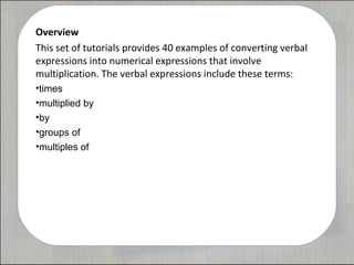 The document contains a comprehensive overview of tutorials aimed at converting verbal expressions into numerical expressions related to multiplication. It includes 40 examples demonstrating how to transform phrases employing terms such as 'times', 'multiplied by', 'by', 'groups of', and 'multiples of' into their numerical counterparts. Each tutorial provides a step-by-step process for one of the expressions listed.