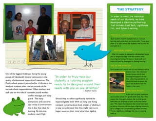 The document proposes a tutoring program partnership between East Tech High School, Lighthouse Inc., and Sylvan Learning to address low graduation rates in Cleveland. Each student would receive individual assessments to evaluate their learning style, grade level, and study skills. They would then receive one-on-one tutoring with a trained volunteer tutor based on an individualized lesson plan. The goal of the program is to advance students two grade levels each year to help them catch up and increase graduation rates.