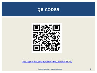 This document summarizes a session on tutoring at the University of South Australia led by Dr. Stuart Dinmore. The session aims to model active learning through group activities, discuss challenges of small classroom and online teaching, and familiarize participants with computer integrated classrooms. Participants engage in thinking exercises like think-pair-share and 3-2-1 to discuss qualities of good teachers and challenges of tutoring. They also use an online collaborative space called Padlet to brainstorm challenges and provide advice to each other. The document provides instructions and contact information for Dr. Dinmore for further assistance.