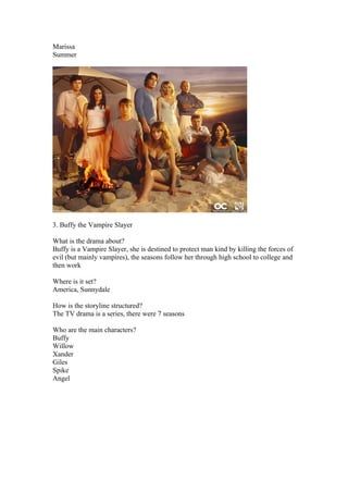 24 is about counterterrorism agent Jack Bauer who works to stop crimes over the course of one day in each season in Los Angeles. The OC follows Ryan's life in Orange County as he moves in with the Cohens. Buffy the Vampire Slayer follows Buffy as she protects mankind from evil forces through high school and college in Sunnydale. Sugar Rush is about 15-year old Kim struggling with her crush on her best friend Sugar in Brighton, England over two seasons.