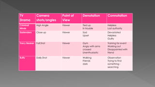 This document discusses different camera shots and angles used in TV dramas and how audiences may interpret them. It provides examples of close-up, medium, and long shots from shows like Grey's Anatomy, Criminal Minds, and Tracy Beaker. Close-ups show intimacy and emotion, helping audiences understand a character's feelings. Medium shots display personal relationships or actions and allow for negotiated readings. Long shots provide context and allow for negotiated readings by showing the setting. It also discusses techniques like pans, tilts, dolly shots, fades, cuts, and wipes used to convey meaning to audiences.