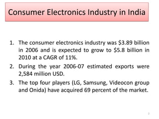 The document discusses flat panel televisions in India. It notes that the market is rapidly shifting from CRT to flat panel displays like LCDs, with LCD share expected to reach 10% by 2010. Flat panel TVs have advantages over traditional TVs like being lighter, thinner, and occupying less space while mounted on a wall. LCD TVs are generally more suitable for static images while plasma TVs have better colors and blacks, though LCDs are more energy efficient. Major manufacturers of flat panel TVs include Samsung, Sony, and LG. The document also discusses factors influencing consumers' purchase decisions and strategies manufacturers can use to penetrate the market.