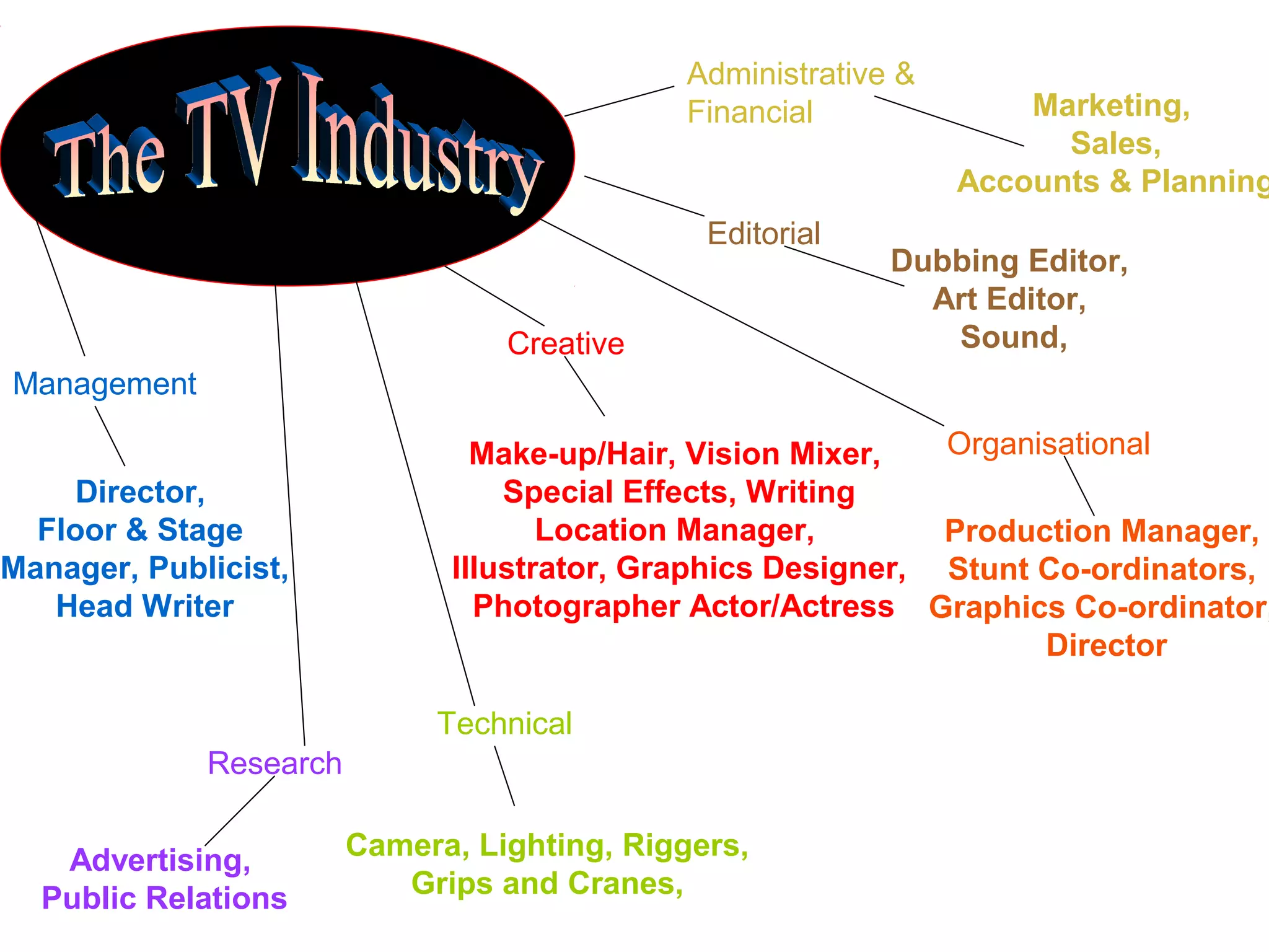 The document outlines the various roles and responsibilities within a television production organization. It divides the roles into categories such as administrative/financial, creative, editorial, technical, organizational, and management. Within each category it provides brief descriptions of several jobs including their main responsibilities and required skills. For example, it describes the director as overseeing all aspects of production including scheduling, budgets, and equipment setup. The marketing role involves market research, campaign planning, and client relations. Sound engineers are responsible for recording and mixing audio to achieve the desired sound effects.