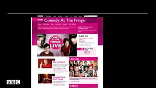 This document discusses the popularity of comedy and comedy/entertainment programs on the BBC iPlayer between 2008-2011. It shows the top 20 most viewed and favorited programs each year, with many comedy and entertainment titles consistently high on the lists. It also discusses the BBC's efforts to better organize and promote its comedy content online, such as launching a dedicated BBC comedy website and increasing comedy content on YouTube and social media platforms. Overall it demonstrates the strong audience demand for comedy content on the BBC iPlayer.