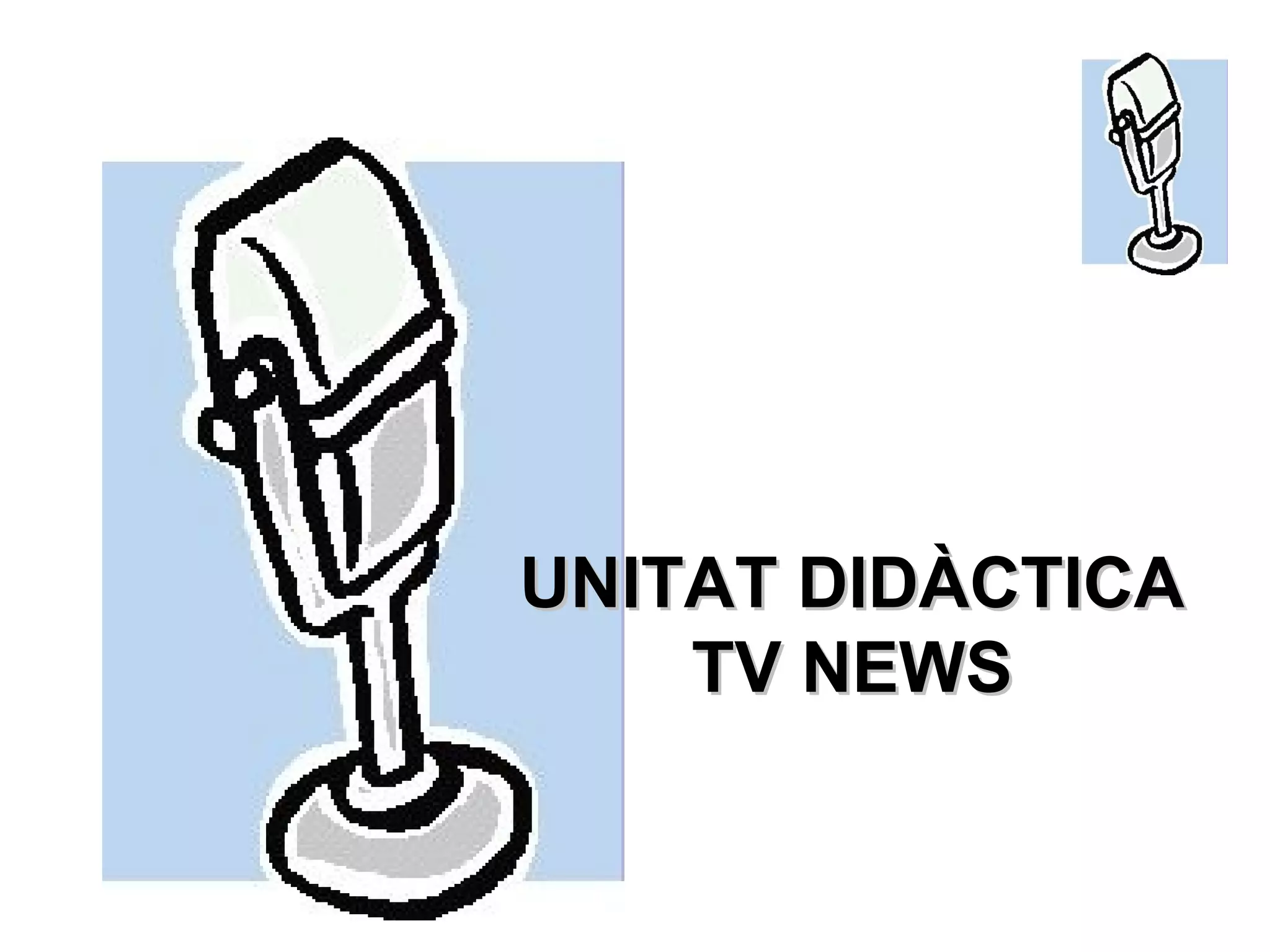 Imagineu que souun grup de reporters de televisió, cadascun d’un tema específic: Notícies Internacionals, Nacionals, Informació Esportiva i Previsió Meteorològica . La vostra missió serà crear i representar un butlletí televisiu de notícies a classe en anglès gràcies a la feina de tots els membres del grup. L’objectiu final serà, a part de saber què passa en el món, millorar la comprensió d’expressions angleses i vocabulari relacionat amb les “ mass media ”. Per començar, contesteu les següents preguntes: T’agrada mirar les notícies? T’agradaria que fossin diferents? T’agradaria ser periodista o reporter en un futur? Creus que aquests programes són importants per la societat d’avui en dia? INTRODUCCIÓ