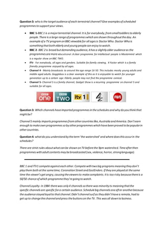 This document discusses TV scheduling and target audiences. It is broken into several questions: