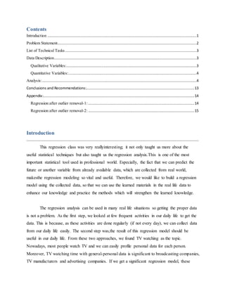This document describes a regression analysis conducted to predict hours spent watching TV based on various personal factors. Data on gender, race, employment status, marital status, cable access, education, age, number of children, income, and leisure time was collected from random individuals. A correlation matrix and scatter plots showed income had the strongest correlation to TV watching hours. Regression analysis found income was the only statistically significant predictor of viewing time. The analysis aimed to help advertising companies target demographic groups most likely to watch TV.