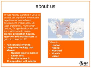 TV App Agency is a company that provides services for developing apps for smart TV platforms. They have experience in software development, UX design, and getting apps approved for connected TV stores. They can handle the full development process from design to deployment. They have developed 11 apps for various customers in an 8 month period, with approval times averaging 4-5 weeks. They have international offices and experienced teams to manage the process.