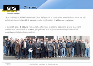 GPS Standard è un leader nella sicurezza con oltre 35 anni di esperienza, specializzandosi in sistemi sofisticati di videosorveglianza e anti intrusione. Il documento descrive l'importanza dell'analisi intelligente delle immagini per migliorare la sicurezza pubblica automatizzando i processi di controllo e presentando vari algoritmi di analisi video, come il rilevamento di movimento e il conteggio delle persone. Inoltre, evidenzia i vantaggi dell'installazione e delle tecnologie integrate, incluse soluzioni di intelligenza distribuita e centralizzata.