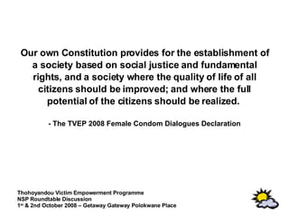 The document discusses issues around access to female condoms in South Africa. It argues that lack of access to female condoms violates human rights and women's rights to make their own reproductive decisions. It notes that female condoms are currently distributed inequitably compared to male condoms in the national strategic plan, which is unacceptable. Finally, it calls for advocacy efforts to pressure the government to revise the national strategic plan to better address the needs and vulnerabilities of women by expanding access to female condoms.