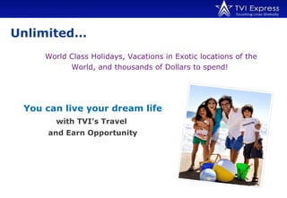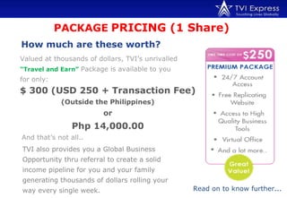 The document describes the pricing and compensation plan for a multi-level marketing company called TVI that sells travel packages. Some key details include:
