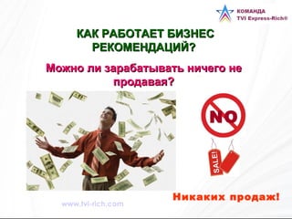 Документ объясняет концепцию бизнеса рекомендаций, в рамках которого люди могут зарабатывать деньги, рекомендуя услуги другим, не продавая ничего напрямую. Он подчеркивает важность лояльных клиентов для бизнеса и предлагает модели сотрудничества, при которых клиенты могут получать скидки и бонусы за рекомендации. Заявляется, что это может существенно повысить рост бизнеса и быть выгодным для всех участников.