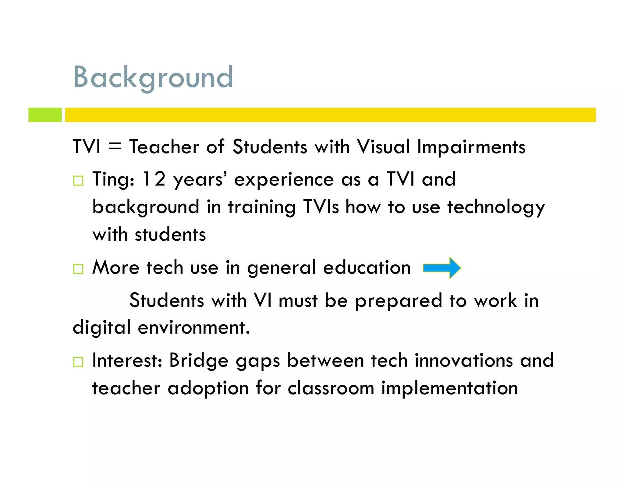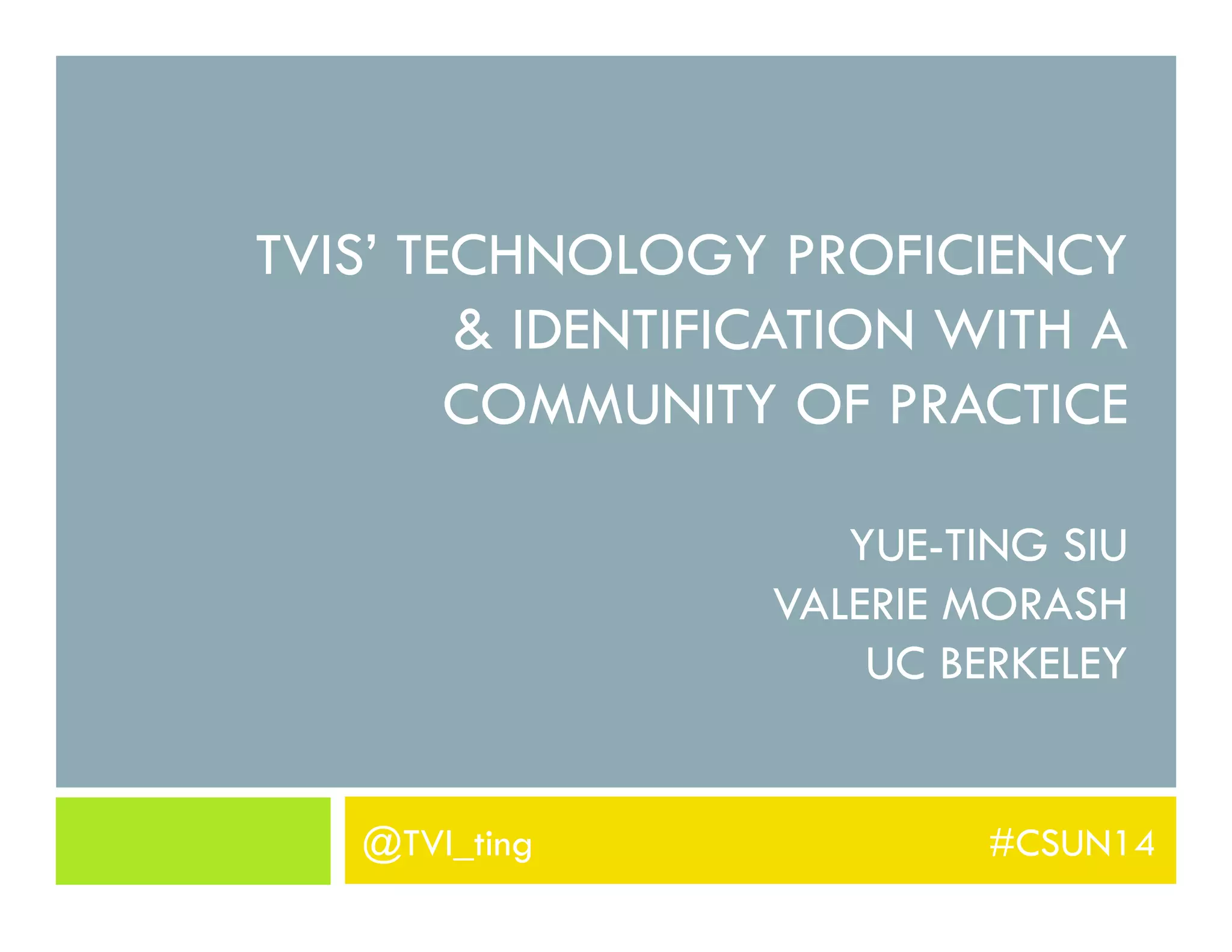 The document discusses the role of Teachers of Students with Visual Impairments (TVIs) in integrating assistive technology (AT) into educational settings, emphasizing the necessity for teachers to adapt to technological advancements. It highlights challenges faced by itinerant TVIs, including isolation and limited access to professional development, while proposing the creation of communities of practice to enhance teacher support and AT adoption. Ultimately, it underscores the importance of student use of AT as the key measure of success in bridging the digital divide.