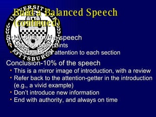This document provides guidance for building an effective speech, including sections on introduction, body, conclusion, transitions, evidence, organization, delivery, practice, and Q&A. It recommends using an attention-getter in the introduction, stating the central thesis, and previewing main points. The body should have 3-5 main points with balanced attention. The conclusion is a mirror of the introduction and doesn't introduce new information. Frequent transitions link parts of the speech. Delivery tips include pausing, varying intonation, eye contact, and a relaxed posture. Rehearsal and familiarity with the room are also advised.