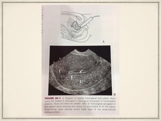 Transvaginal ultrasound (TVS) can be used for early first trimester obstetric ultrasounds, evaluating complications in later pregnancy like placenta previa, assessing the fetal spine position, and evaluating the nuchal region before 14 weeks. It is also used to evaluate suspected ectopic pregnancies, monitor follicle development during fertility treatments, and monitor ovarian response during assisted reproductive technology cycles. The procedure involves first performing a transabdominal ultrasound with a full bladder, then emptying the bladder and inserting the transvaginal probe to obtain images of the cervix, uterus, ovaries, and surrounding structures in both the sagittal and coronal planes. Key anatomical structures like the uterus and ovaries are described in