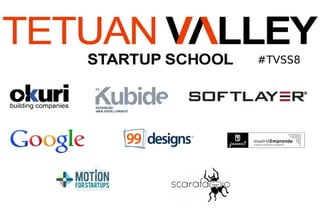 Tetuan Valley Startup School 8 was held in spring 2013 and consisted of weekly classes on topics relevant to starting a company such as customer development, software development, and finance. Each class was structured with a main topic presentation, guest speaker, and group discussion. Students also had time for pitching practice and workshops. The 6-week course culminated in a hackathon and included classes on customer validation, metrics, corporate finance, and attracting investors.