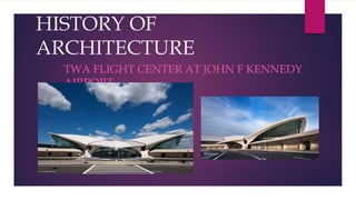 Eero Saarinen designed the TWA Flight Center at JFK Airport in the 1950s to capture "the spirit of flight". The futuristic building resembles a bird in flight, with a thin concrete shell roof supported by four curved columns. It has large windows overlooking the runways and skylights separating its four symmetrical "wings". The complex curved geometry was inspired by citrus fruits and aimed to provide smooth passenger flow. The building pioneered many airport innovations when it opened in 1962 but fell into disuse and closed in 2001.