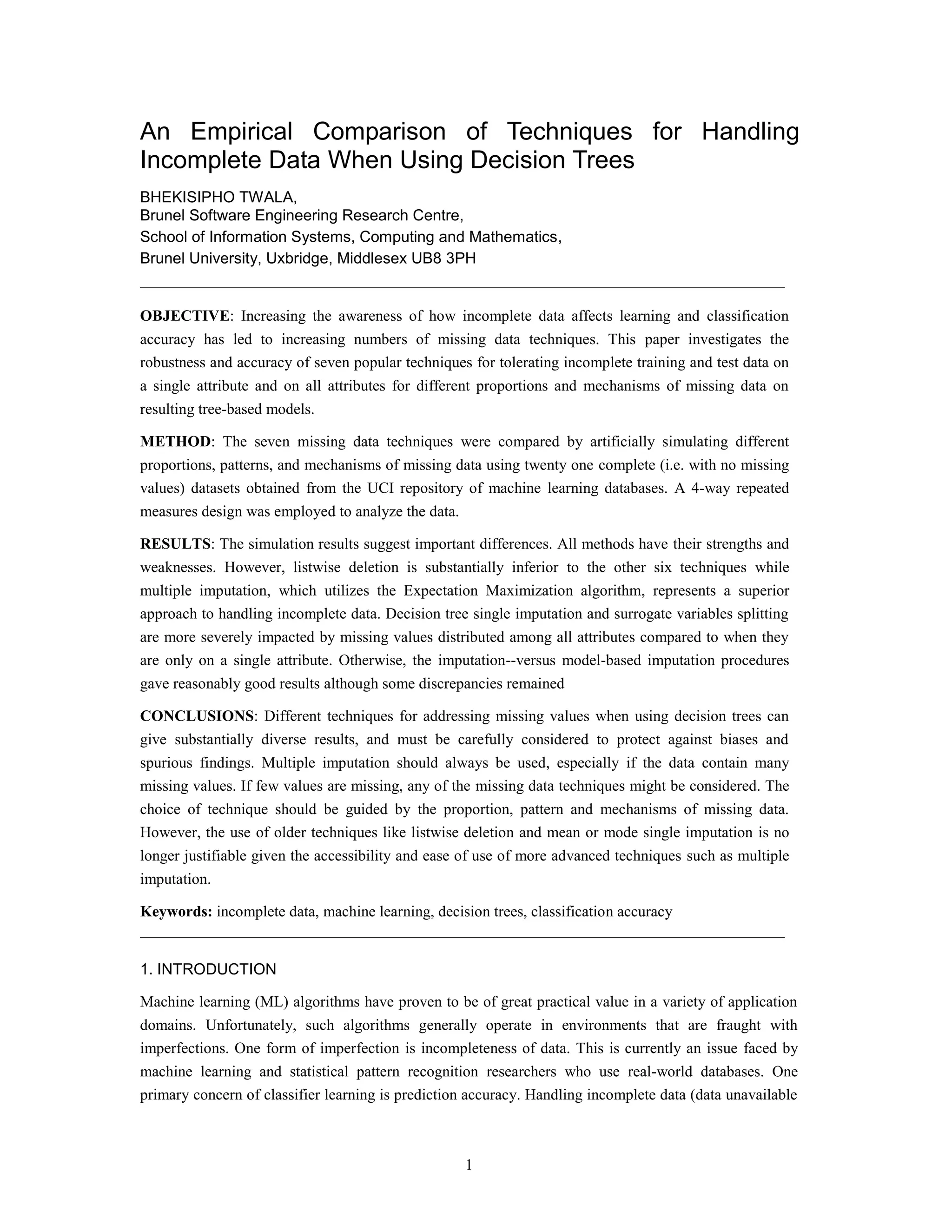The document compares techniques for handling incomplete data when using decision trees. It investigates the robustness and accuracy of seven popular techniques when applied to different proportions, patterns and mechanisms of missing data in 21 datasets. The techniques include listwise deletion, decision tree single imputation, expectation maximization single imputation, mean/mode single imputation, and multiple imputation. The results suggest important differences between the techniques, with multiple imputation and decision tree single imputation generally performing better than the others. The choice of technique depends on factors like the amount and nature of the missing data.