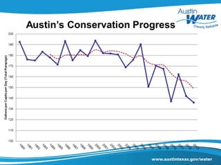 The document discusses the management of rate impacts related to water conservation efforts in Austin, beginning in the 1980s and evolving through various strategies including education, incentives, and code requirements. It highlights the challenges posed by a growing population and drought risk, alongside proposed changes to residential water rates and revenue stability methods to ensure financial sustainability. Key strategies include increasing the fixed billing portion, implementing a revenue stability fee, and restructuring volumetric rate tiers.