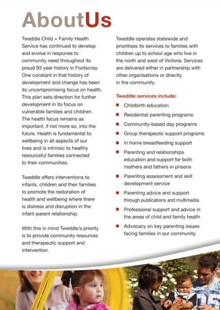 Tweddle Child and Family Health Service is a statewide early intervention organization that aims to support families with children from birth to school age. It has operated for 93 years in Footscray, Victoria, focusing on health and vulnerable families. The document outlines Tweddle's strategic plan from 2012-2017 to continue providing services like parenting programs, health education, and therapeutic support. The goals are to expand services, support families facing various challenges, deliver services in areas of high need, build organizational capacity, and collaborate with other organizations.