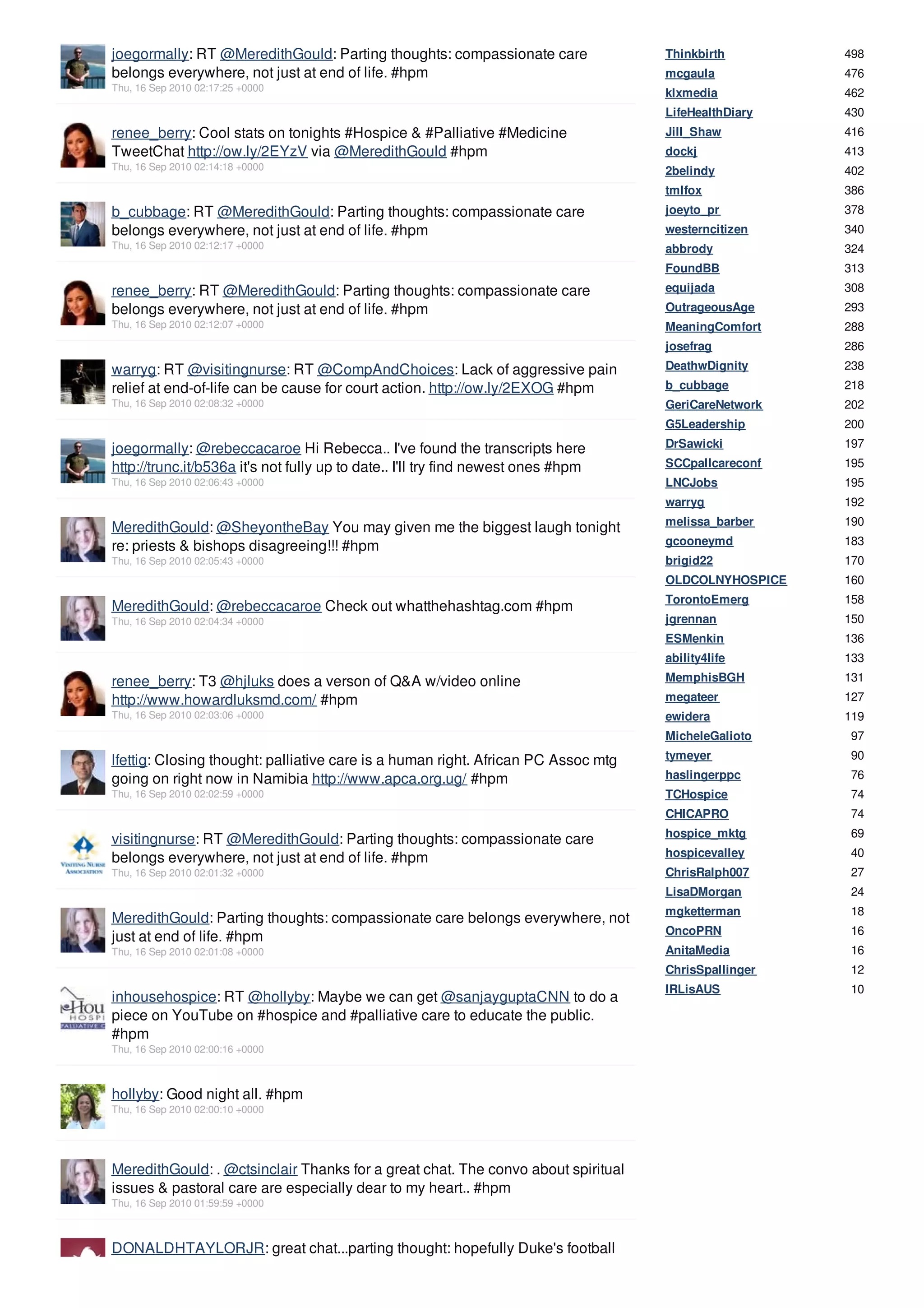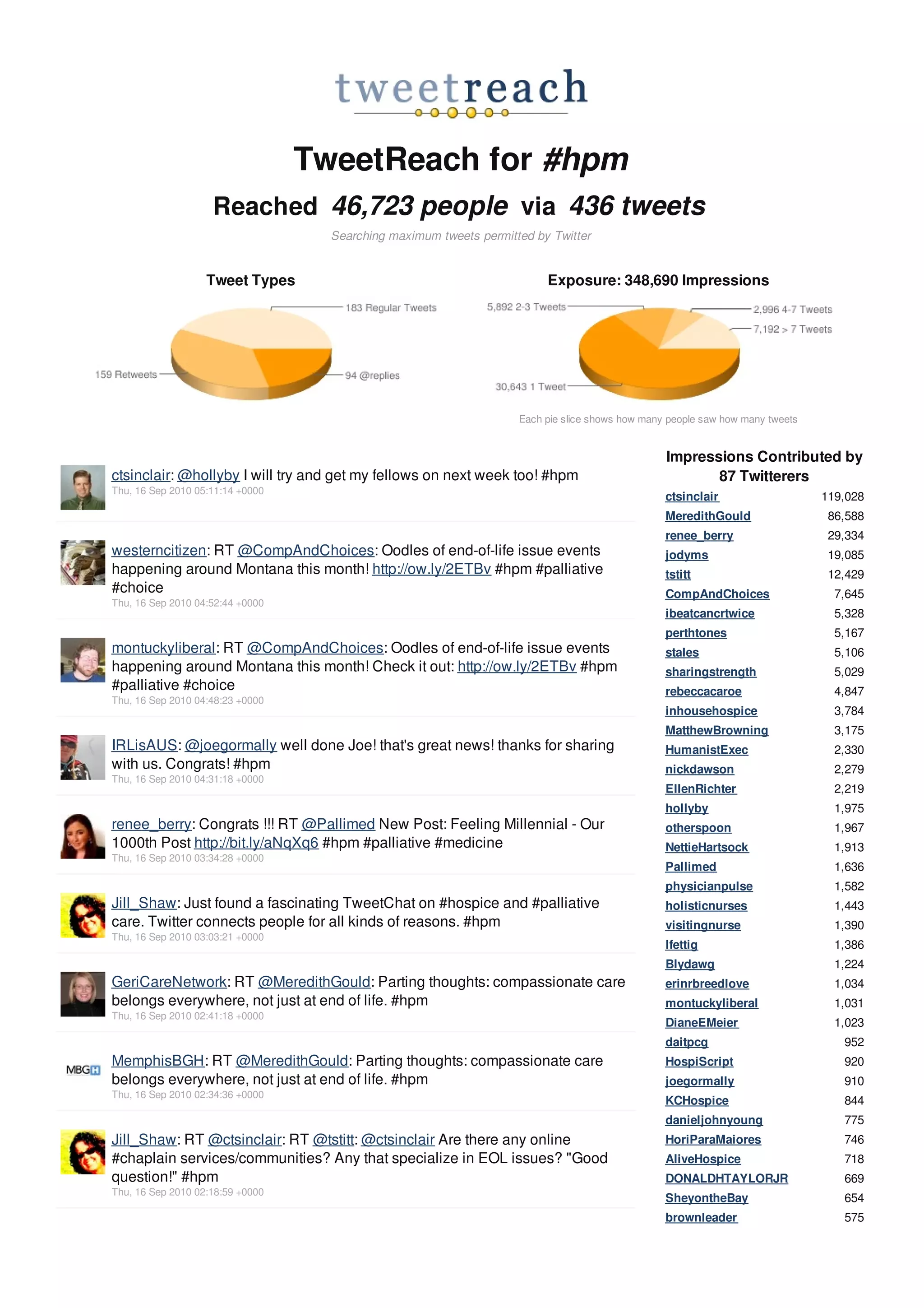 This document summarizes the reach and impact of tweets about hospice and palliative medicine (#hpm) on Twitter. It shows that 436 tweets reached 46,723 people and generated 348,690 impressions. The most influential tweeters who contributed the most impressions are identified.