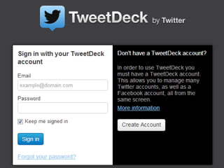 TweetDeck is a free social media dashboard application that allows users to manage their Twitter and Facebook accounts from one centralized location. It provides a column-based interface that separates tweets, direct messages, replies and other social media content for easy viewing and management. Both individuals and businesses can use TweetDeck to efficiently track tweets, follow topics, see updates from multiple accounts and pages, and engage with their audiences across different social networks.