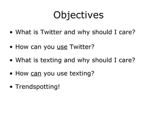 The document discusses the usage and benefits of Twitter and texting in sharing ideas, connecting with others, and trendspotting. It highlights key Twitter terminology, statistics showing its rapid growth, and various ways to utilize Twitter effectively, especially for librarians and educators. Additionally, it mentions the importance of integrating texting services for enhanced communication in library settings.