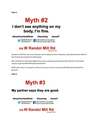 This document debunks common myths about HIV/STDs through a series of tweets. It discusses topics like how condoms can effectively reduce risk of infection if used correctly and consistently, how STD symptoms may not always develop or be easy to identify, the importance of regular testing and screening, and that HIV/STDs can affect anyone regardless of gender, race, or orientation. The tweets encourage learning more about prevention and health at an upcoming Know Your Health Fair on June 27.