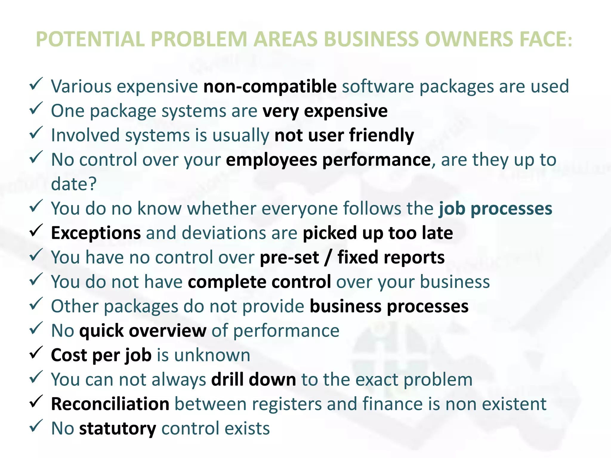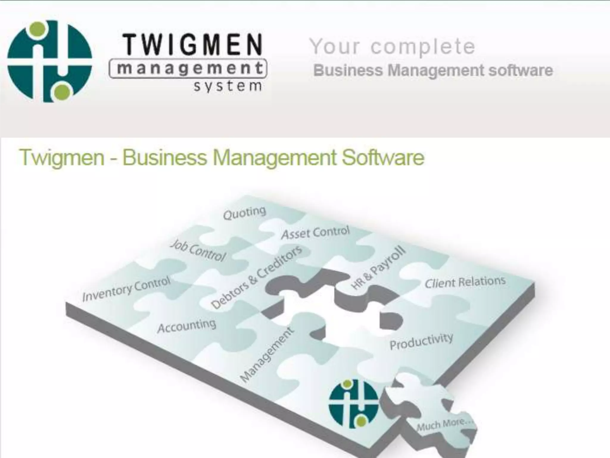 The document discusses potential problem areas business owners face, such as using expensive incompatible software and lack of control over business processes and employee performance. It then introduces Twigmen as a software solution that resolves these problems by providing a single, integrated system that gives full control over all business processes and offers ongoing support. Finally, it provides details on Twigmen's functionality, business philosophy, and types of current clients it is suitable for.