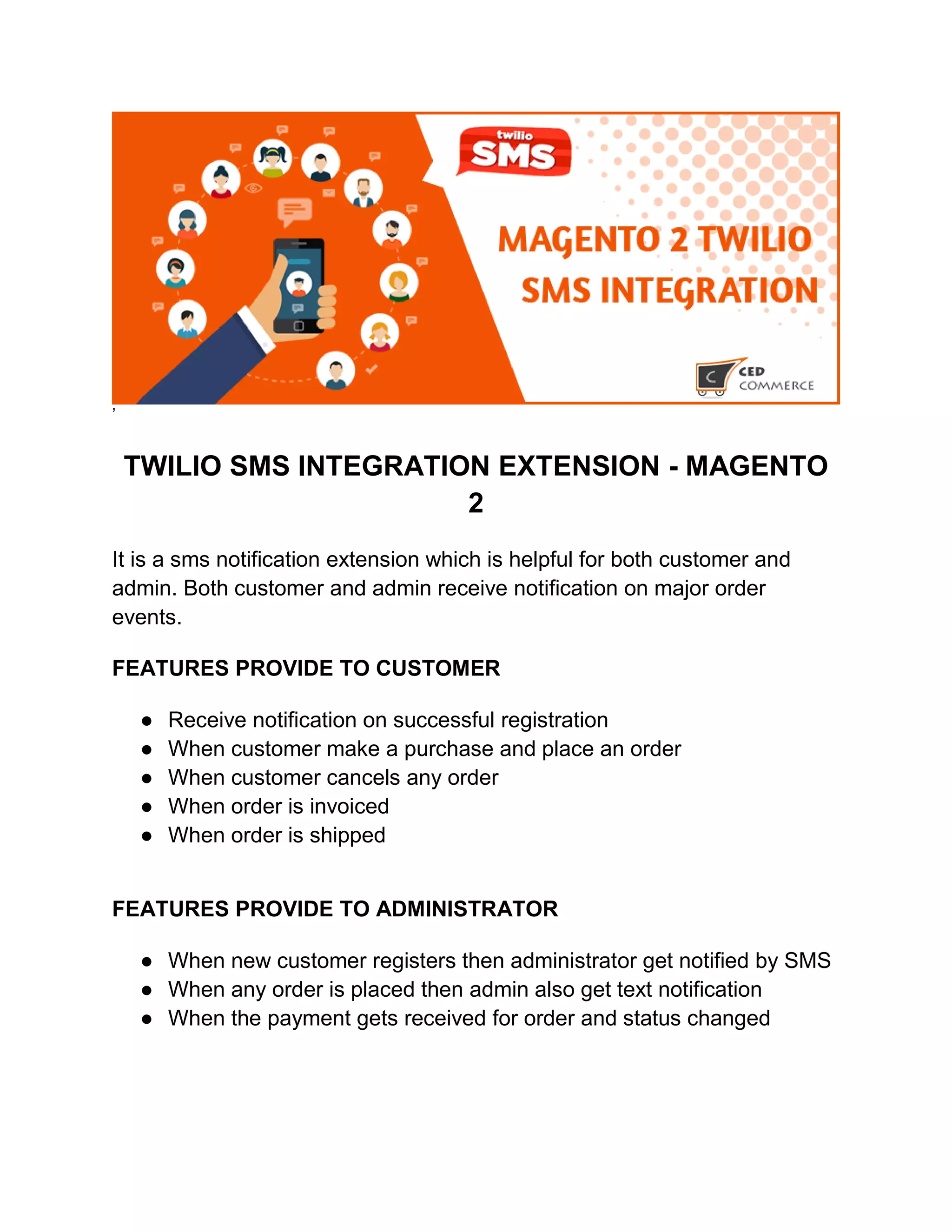 The Twilio SMS Integration extension for Magento 2 provides SMS notifications for both customers and administrators regarding major order events. Customers receive alerts for registration, order placement, cancellations, invoices, and shipping, while administrators are notified of new registrations, order placements, and payment status changes. More information, including documentation and screenshots, is available on the product page.