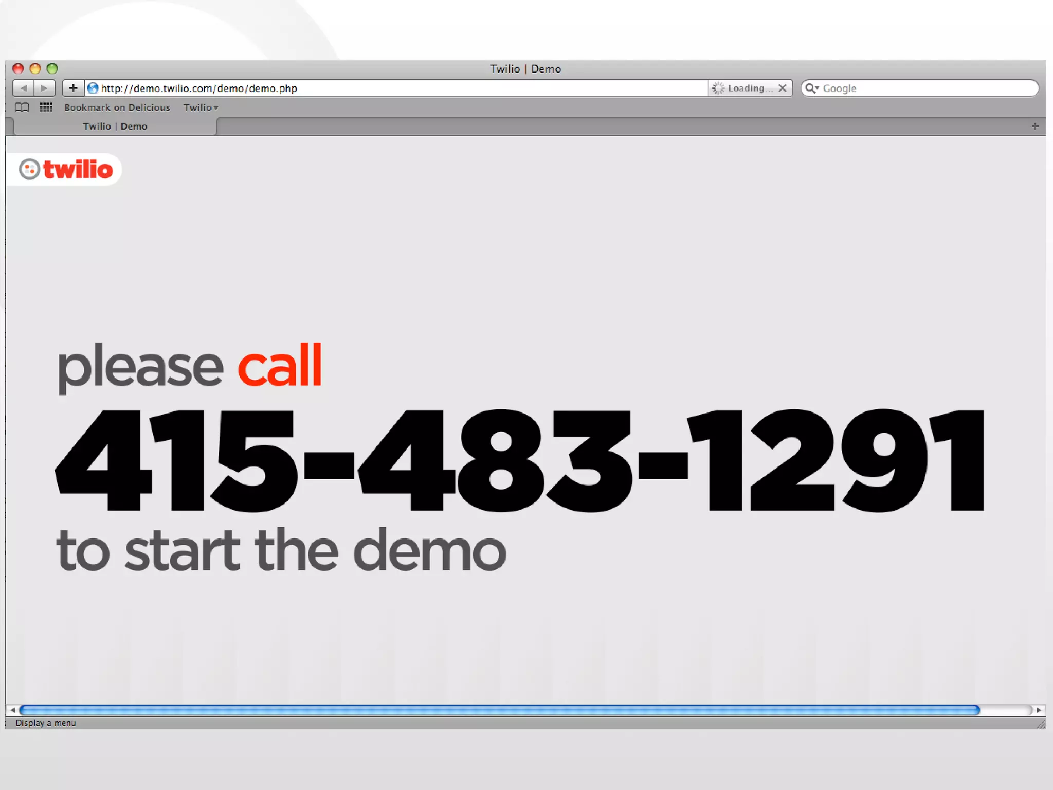 Twiliobot allows adding voice capabilities to Google Wave by enabling Waves to interact with the telephone network. The Twiliobot demo allows adding a phone number to a Wave to enable calling. Twiliobot finds phone numbers in Waves and adds "Call" buttons to detect clicks and initiate calls. State is communicated through the App Engine datastore. The Twiliobot code is available on Google Code. Twilio is a cloud service that allows building voice communication apps through a simple API.