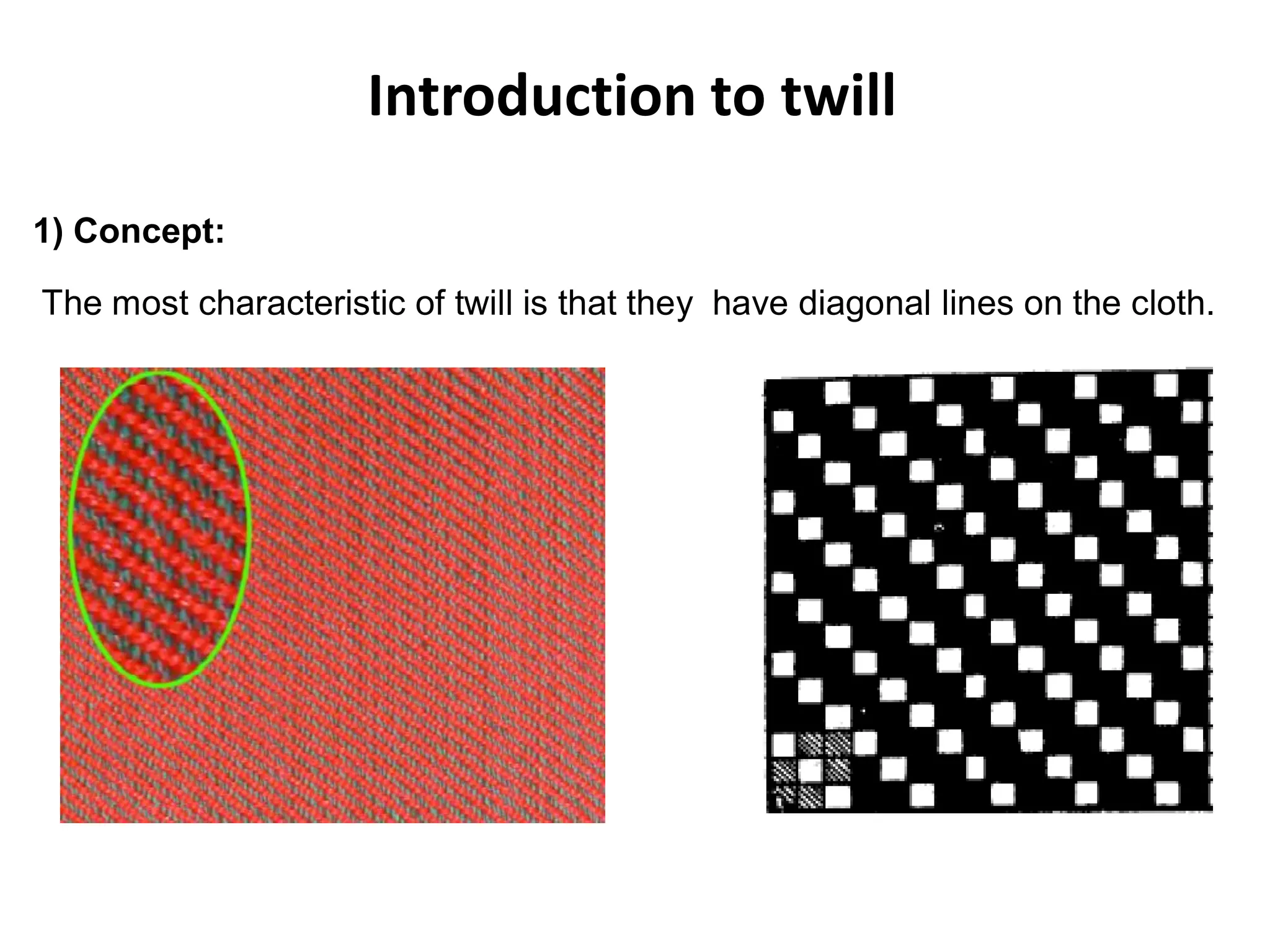 (1) Continuous twills that form diagonal lines across the fabric with variations in warp/weft float ratios.
