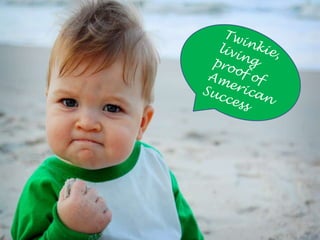 This document discusses the history of the Twinkie snack cake. It mentions James Dewar inventing a cream-filled snack cake in 1930. Twinkies became an American icon during World War II and were produced by the Hostess brand. The document then references the brand's success, misfortune, transformation, and enduring popularity over time despite financial difficulties.