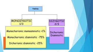Twin pregnancy occurs when a woman carries two fetuses at the same time. There are two types of twins: monozygotic (identical) twins, which develop from the splitting of a single zygote, and dizygotic (fraternal) twins, which develop from two separate eggs fertilized by two separate sperm. Monozygotic twins share the same placenta and have identical DNA, while dizygotic twins have separate placentas and are no more genetically similar than normal siblings. The document further details the development and characteristics of both types of twins.