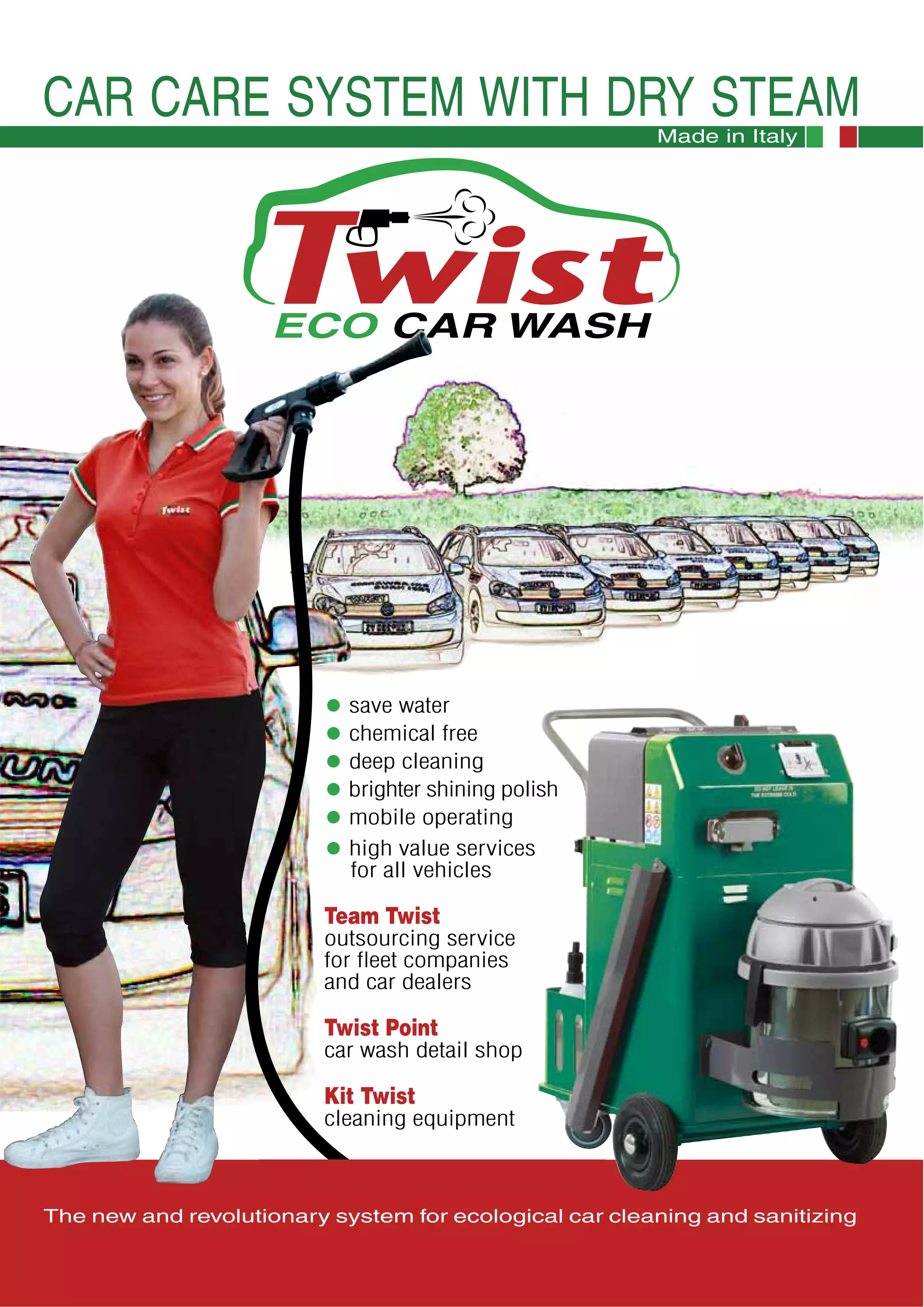 The document summarizes an ecological car cleaning and sanitizing system called Twist Eco Car Wash that uses steam instead of water or chemicals. It saves water, is chemical-free, offers deep cleaning and polishing. Services include mobile detailing, fleet management, and retail car wash shops. Steam sanitizes interiors, kills bacteria and parasites, and leaves surfaces clean and dry without scratches. The system uses little water and produces no wastewater, offering environmental and business benefits.