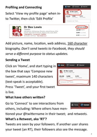This document provides an overview of how to use Twitter, including how to set up an account, send tweets, follow others, use hashtags, and more. It explains the basic features of Twitter such as the 140 character limit for tweets and how retweets work. Finally, it offers tips for using Twitter and highlights some of its uses for information sharing, marketing, research, and staying connected with communities of similar interests.