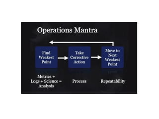 • 주문, 계측, 로그(기록), 과학적 분석, 시스템 개선, 병목 제거를 여러 번