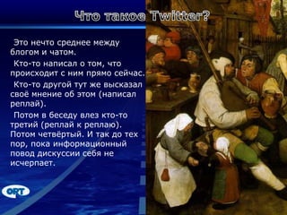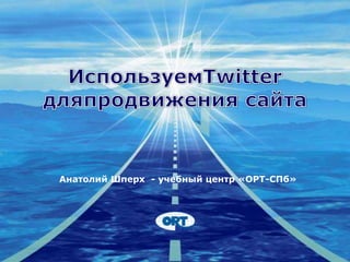 Документ описывает использование Twitter как инструмента для продвижения компании и увеличения посещаемости сайта. Он объясняет ключевые термины платформы и дает советы по эффективному общению и взаимодействию с аудиторией. Основное внимание уделяется важности активного участия и качественного контента для привлечения подписчиков и распространения информации.