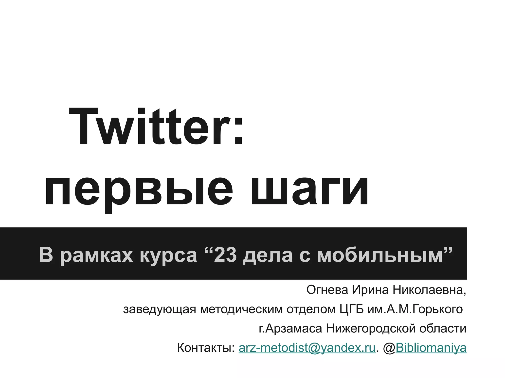 Документ описывает процесс регистрации и использования аккаунта в Twitter, включая создание профиля и написание твитов. Основное внимание уделяется важным функциям платформы, таким как использование упоминаний и хэштегов для взаимодействия и построения сети. Дополнительные советы и полезные инструменты для оптимизации работы в Twitter также представляются в документе.