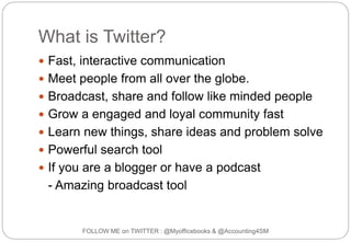 The document provides guidance on using Twitter, including how to sign up, build a profile, follow others, engage with your followers, use hashtags and visuals, participate in Twitter chats, and grow your follower base. The key steps outlined are to sign up with your real name and photo, follow others in your industry, engage by liking and responding to tweets, use hashtags and images to make your tweets stand out, and participate in organized Twitter chats to meet new people and expand your network. Regularly interacting with followers and scheduling tweets in advance are recommended for ongoing engagement.