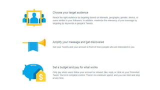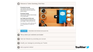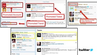 Twitter is a microblogging platform that allows users to post short messages called tweets. It gained popularity as one of the hottest tech companies since Google and Facebook. While half of its initial user base came from the US, Twitter has become influential in sociopolitical events worldwide. It employs an open platform and simple interface, allowing users to easily connect with others and engage through interactions like retweets. Nearly all of Twitter's revenue comes from advertising, including promoting tweets, accounts, and trends. Advertisers typically set daily budgets and pay per click or retweet. The document then provides examples of successful marketing campaigns by companies and organizations that used Twitter promotion.