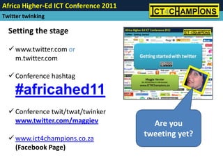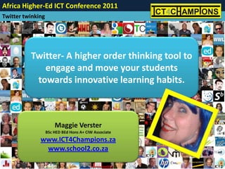 This document discusses how Twitter can be used as a tool to engage students and promote innovative learning. It suggests ways Twitter can be used, such as posting assignments, sharing summaries and news, and connecting students globally on projects. The document advocates using Twitter to build communication and relationships, participate in professional learning networks, and share resources. It also questions how to get students to think critically through their Twitter use and provides examples of tools that can be used along with Twitter.