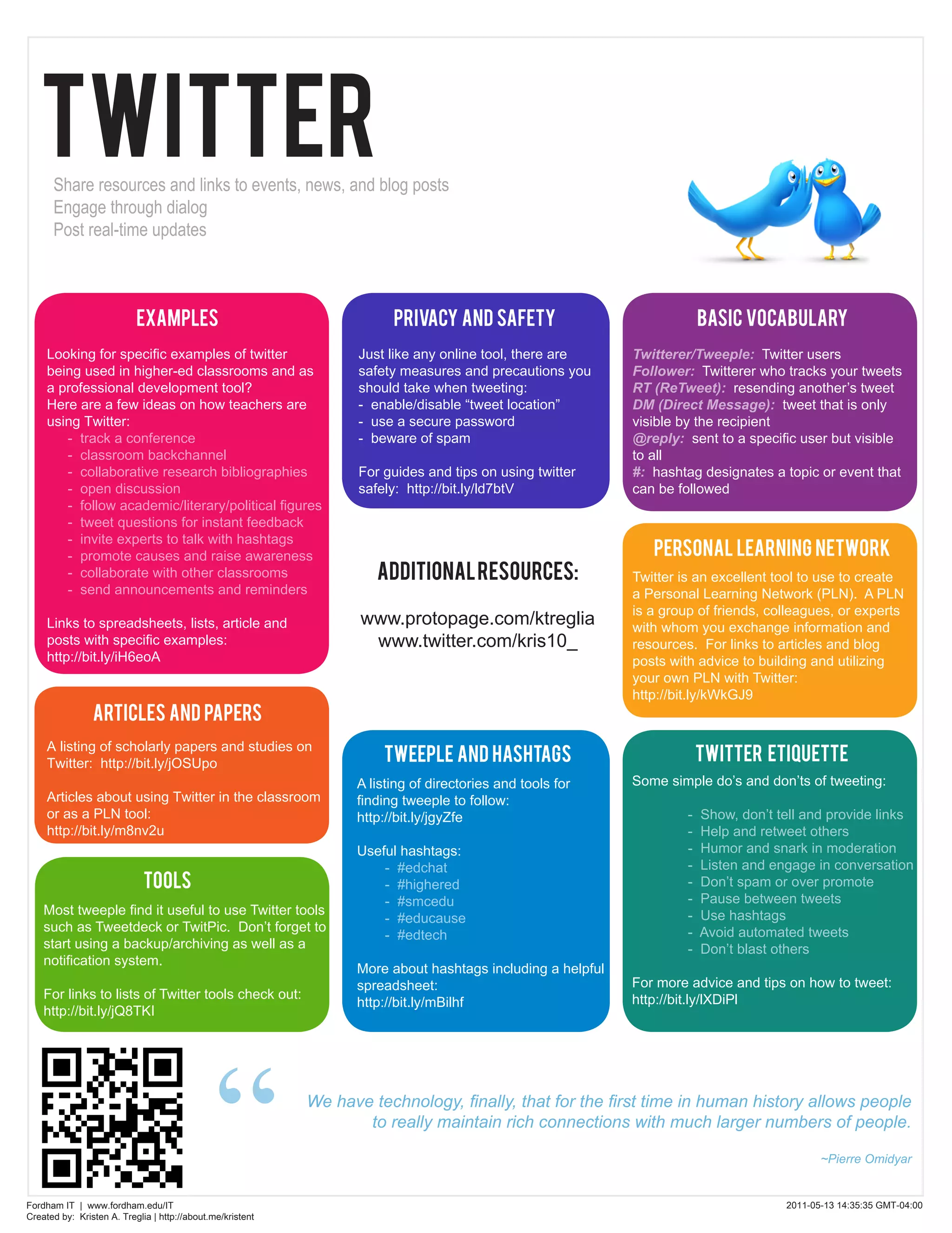 The document provides guidelines on effectively using Twitter as a professional development tool in educational settings. It highlights key features like tweeting, retweeting, direct messaging, and using hashtags for engagement and collaboration while emphasizing the importance of maintaining privacy and safety. Additionally, it suggests resources and etiquette for building a personal learning network and using Twitter for academic purposes.