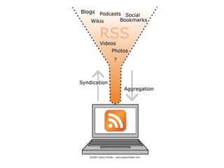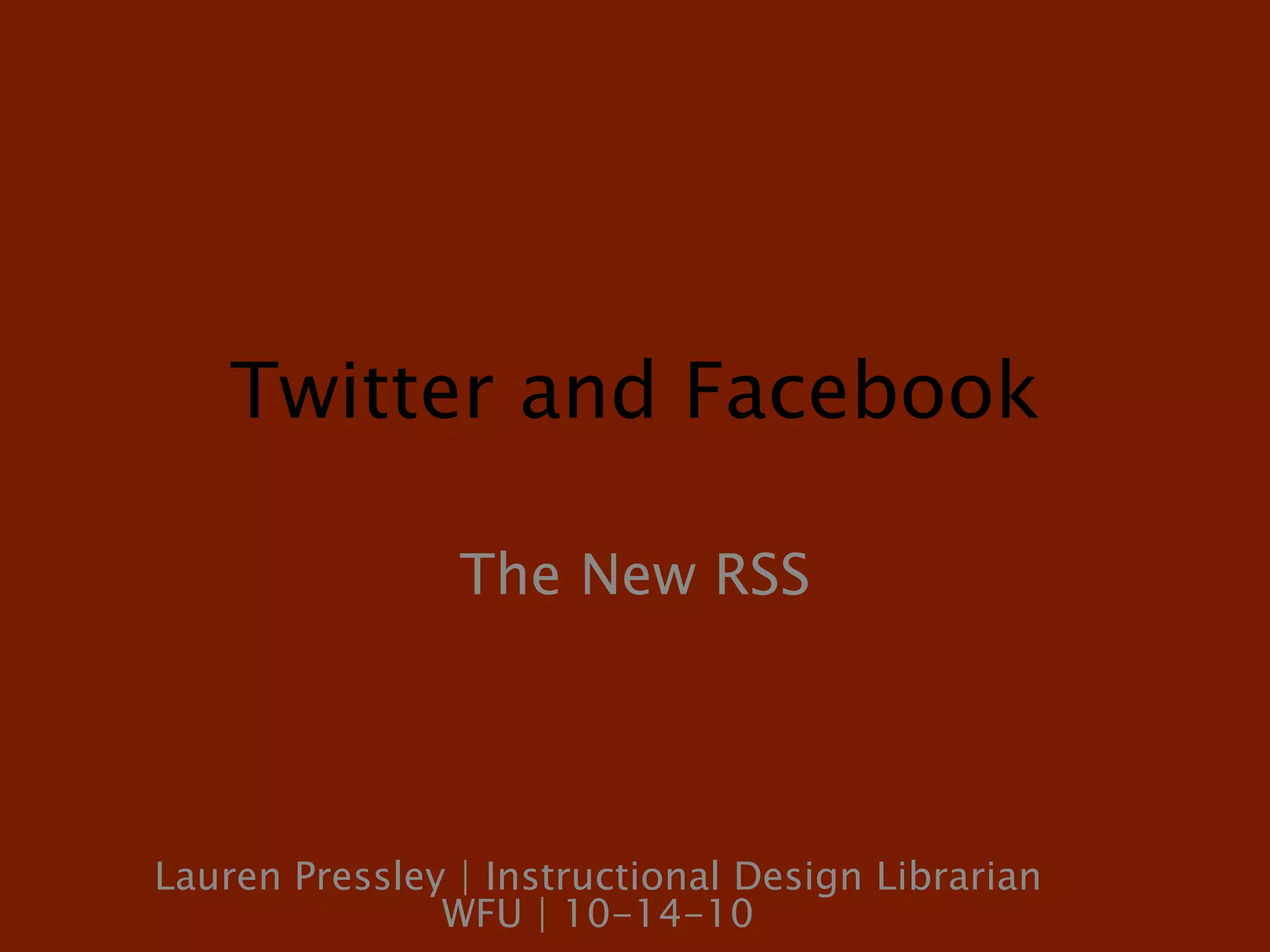 Twitter and Facebook can serve as replacements for RSS feeds by allowing users to follow topics and people of interest to receive updates in a centralized location. The document discusses how information overload from blogs led to the decline of RSS services and describes how social networks address this issue through features like Twitter Lists, Facebook Groups, and third-party applications like TweetDeck that organize information flows.