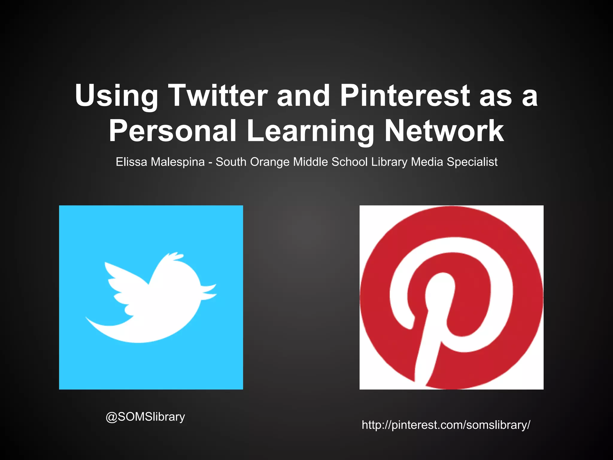 It provides an overview of how Twitter and Pinterest can be used professionally by educators, including for collaborating, finding resources and ideas, and participating in online discussions. Specific tips are provided on setting up accounts, following others, engaging in chats, and using hashtags on Twitter. Pinterest is described as a way for educators to organize and share visual resources like lesson plans, articles and student work. Livebinders with additional information on setting up a Twitter PLN and using Pinterest are also referenced.