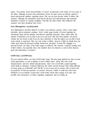 The document summarizes the Twitter accounts of several educators that a student followed for a class assignment. It provides details on each educator's Twitter presence and content, noting those that were most useful and informative for the student as a teacher candidate. The student found the Twitter accounts of Gwyneth Jones and Josh Stumpenhorst to be the most beneficial, sharing educational resources and a personal touch. The student also approved of the Twitter account for Wise in WV for its open support of sexual health issues.