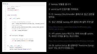 트위터봇 만들기 튜토리얼. 장고걸스 2016년 10월 멜팅팟 세미나 발표 자료입니다.