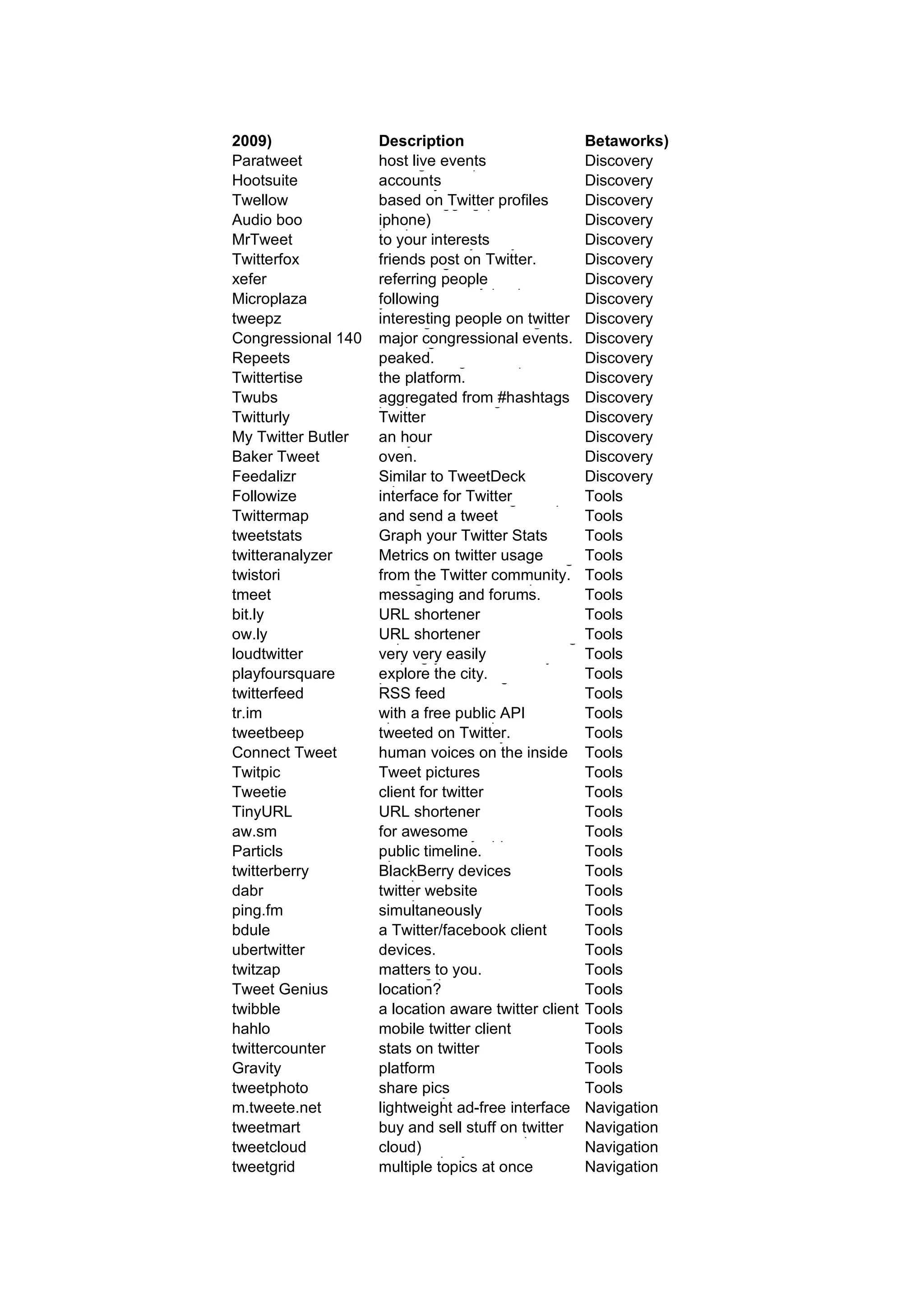 (1) Twitter clients and services that allow users to manage multiple accounts, discover new people to follow, and track trends and topics on Twitter. (2) Tools for URL shortening, posting to multiple networks at once, and monitoring specific words or hashtags. (3) Navigation and organization tools like desktop clients, dashboards, and services that organize Twitter into threads, streams and lists. (4) Search and discovery services that find relevant tweets, users, videos and products based on search terms or what others are talking about.