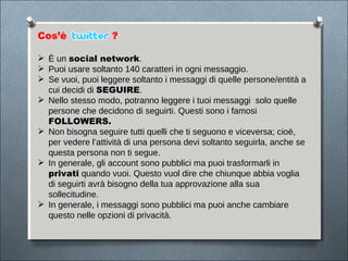 Il documento descrive Twitter come un social network che consente di inviare messaggi di massimo 140 caratteri a follower selezionati. Gli utenti possono impostare la privacy del proprio profilo e interagire tramite tweet, retweet e messaggi diretti. Viene anche menzionato l'uso di hashtag per categorizzare contenuti e il concetto di trending topic per seguire le discussioni più popolari.