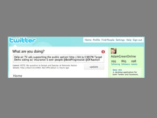 The document discusses using Twitter as an organizing tool. It provides examples of how Twitter can be used to share links and information but has relatively low conversion rates for driving people to take direct action like signing petitions compared to blogs. Twitter is better suited for conference communication, sharing information with reporters who may follow influential users, and experimenting with new organizing techniques like Twitter petitions and fundraising. The key is having a clear strategy and metrics for success rather than just driving clicks.